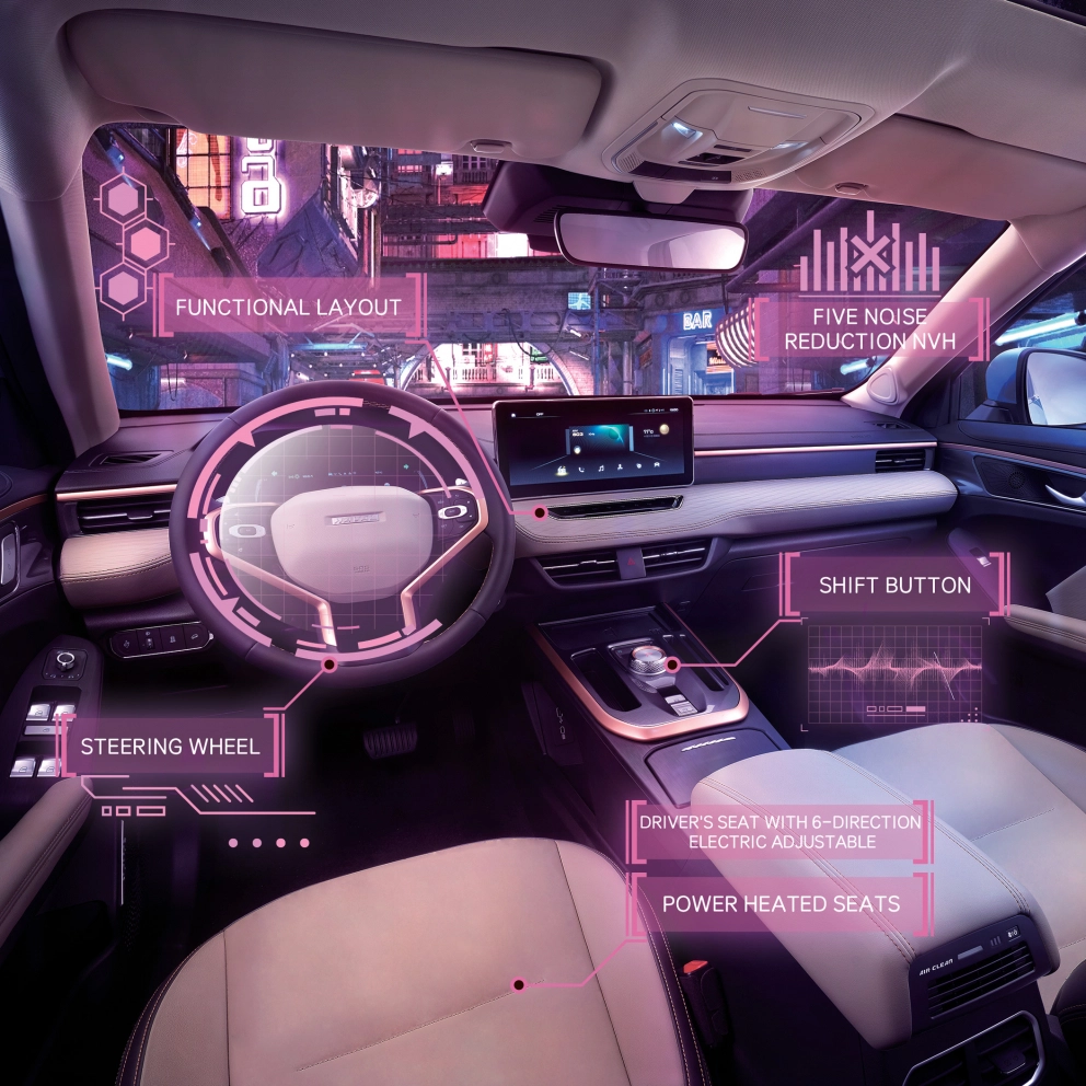 Convenient gearshift module, three-screen intelligent communication, comfortable seat heating, USB interfaces and wireless charging for mobile phone – HAVAL JOLION interior is characterized by minimalist aesthetics combined with technologies of the future that open up new possibilities and change the traditional environment.